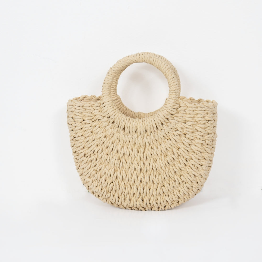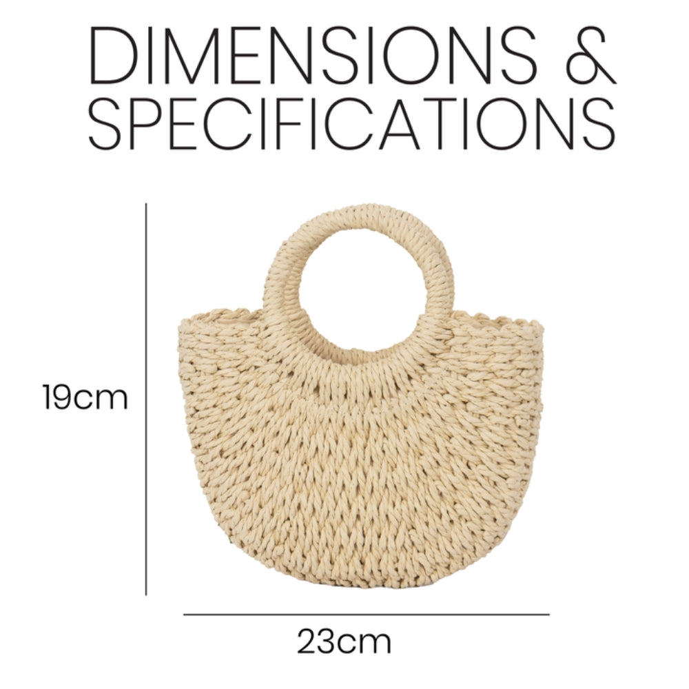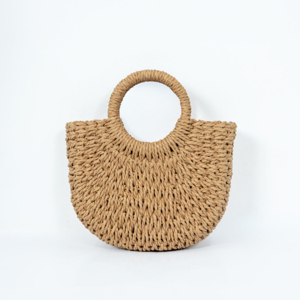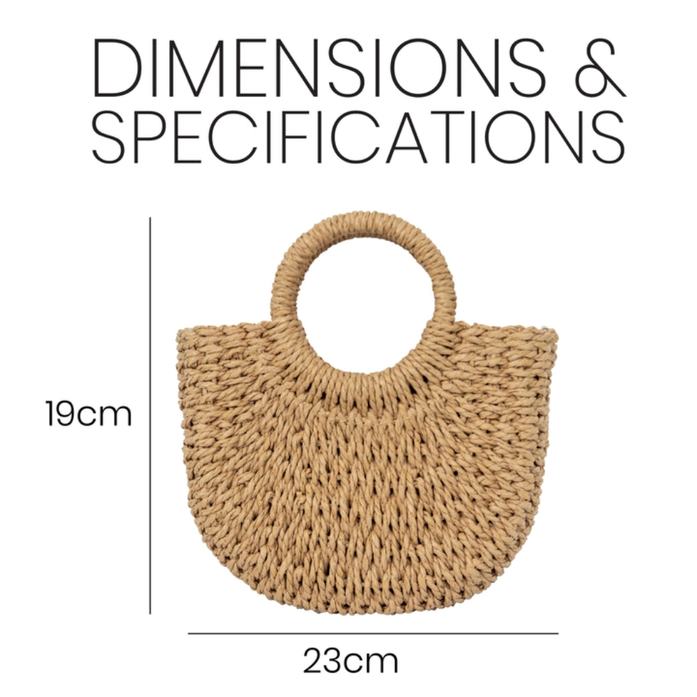 أضفِ لمسةً أنيقةً إلى مجموعة إكسسواراتك مع حقيبة اليد المنسوجة الصديقة للبيئة من القش. مصنوعة من قش ورقي طبيعي ومبطنة ببوليستر ناعم، يتميز هذا التصميم الأنيق بشكل مروحة فريد ومقابض دائرية متينة. مثالية لمواعيد الغداء، أو نزهات الشاطئ، أو رحلات التسوق غير الرسمية، فهي مزيج مثالي بين سحر الريف والأناقة العصرية.