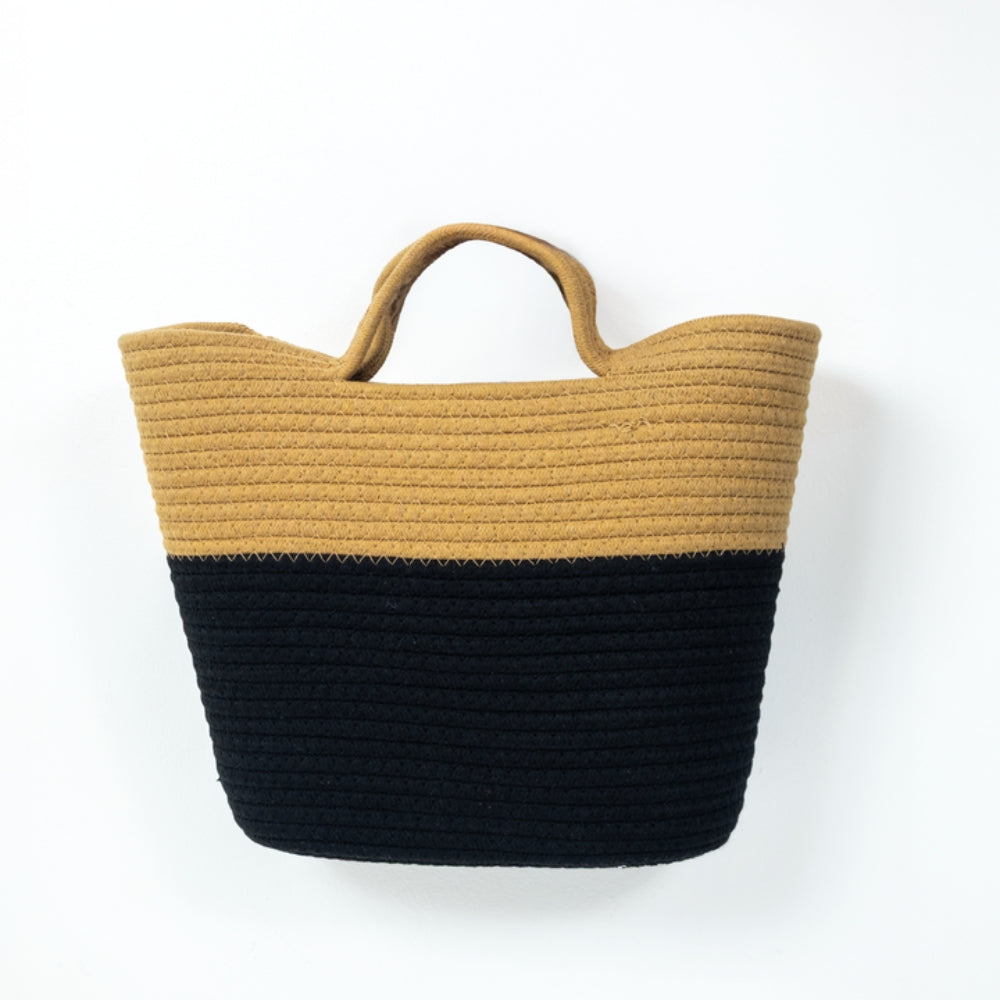 تألقي بإطلالة جريئة مع حقيبة توت القش المنسوجة ثنائية اللون والصديقة للبيئة. تتميز بجزء علوي أنيق بلون الجمل وجزء سفلي أسود، هذا التصميم الواسع مثالي لرحلات الشاطئ، أو التسوق، أو النزهات غير الرسمية. مصنوعة من قش ورقي متين، تجمع بين الملمس الطبيعي والأناقة العصرية.