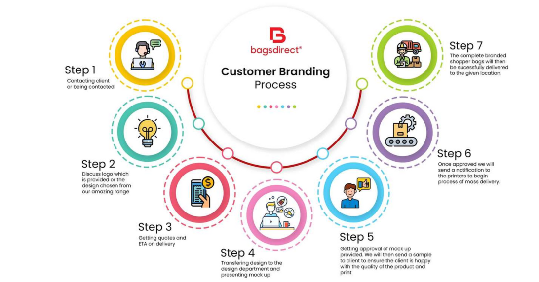 Our creative branding process is as simple as 7 steps. Make contact with one of our amazing sales team and have your shoppers branded now. We aim to keep all customers happy and to meet deadlines.