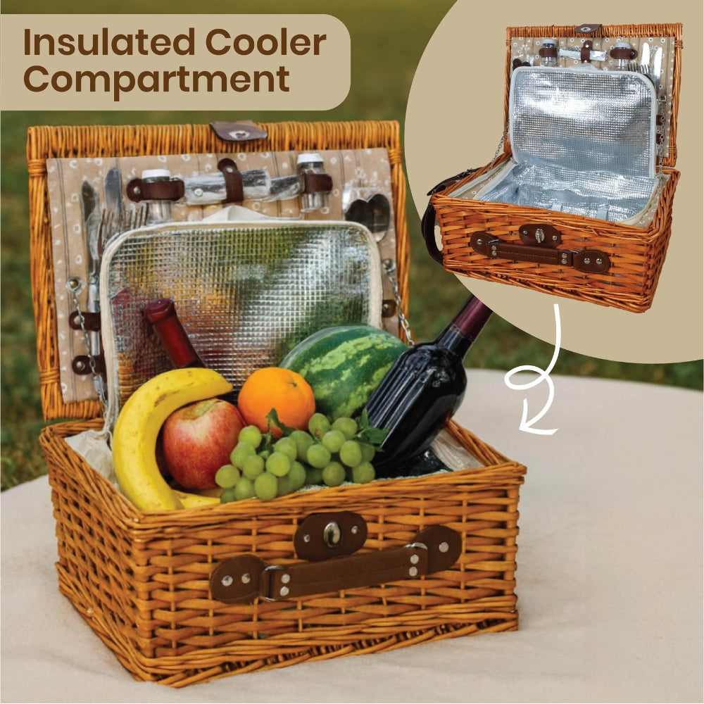 Classic Full Willow Wicker Basket – 4-Person Picnic Set with Blanket - Sand Flower